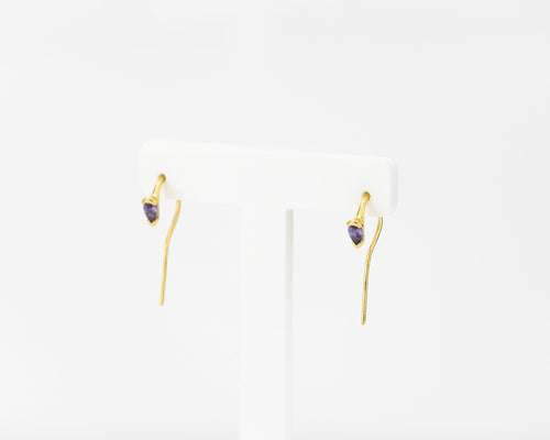 CZ drop wire earring, amethyst huggie hoop, drop hoop earring, unique dainty earring, pear cut cz, dainty gold earring, February birthstone