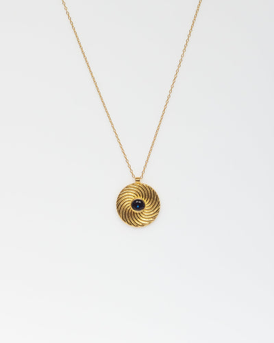 Vintage sunbeam necklace, large sunburst, gold coin pendant, cz sapphire, ancient medallion, statement, sunshine, eternal spiral boho circle