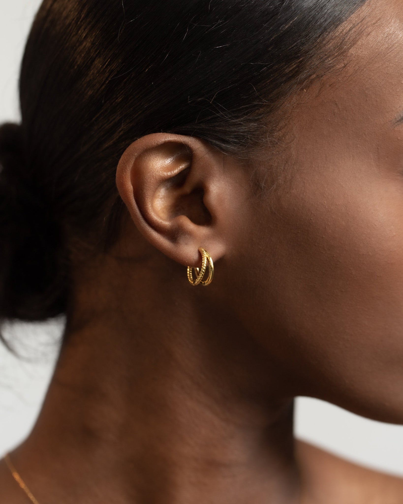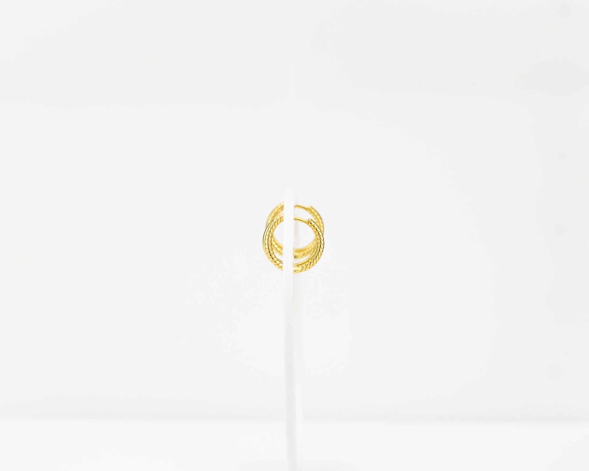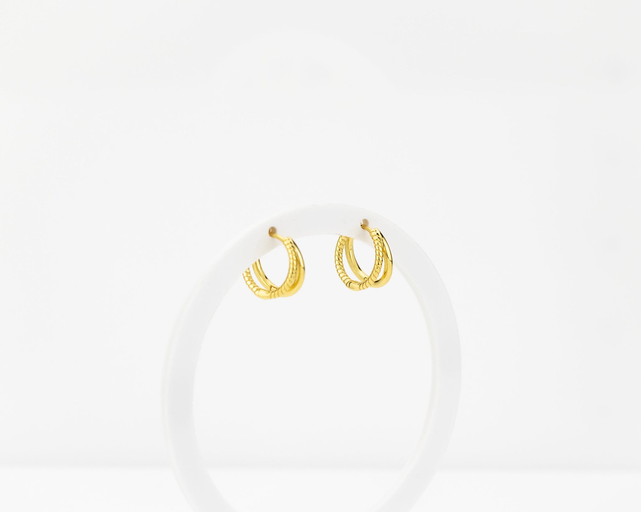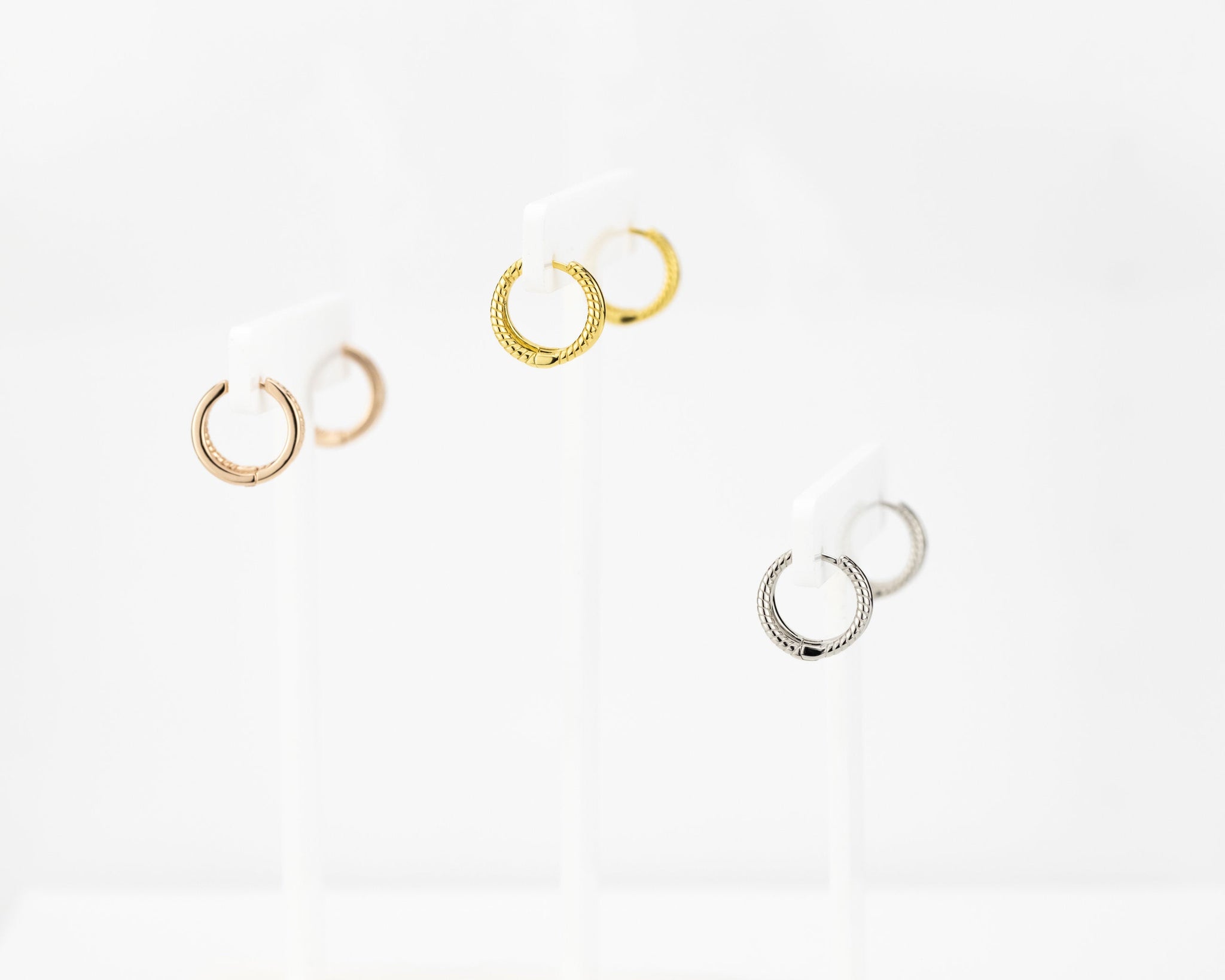 "DESSA," double layer twist rope hoop earrings. These simple, vintage inspired hoop earrings are made with 925 sterling silver throughout, plated with a layer of 18k gold, rose gold or white gold/rhodium (silver colour). They feature two layers of hoops joined together at the top, with one layer comprising of a twist rope pattern. They're ultra comfortable, very lightweight (1.71 grams each piece) and with the click hinge closure, easy for everyday styling. Total hoop outer hoop diameter is 1.5cm; inner diameter 1.2cm