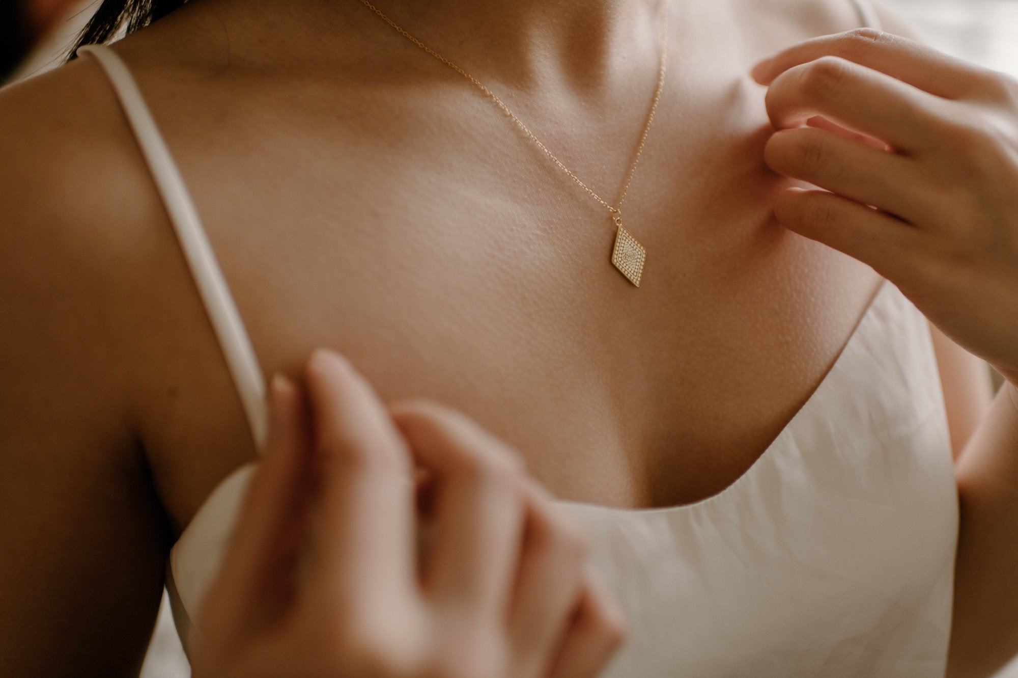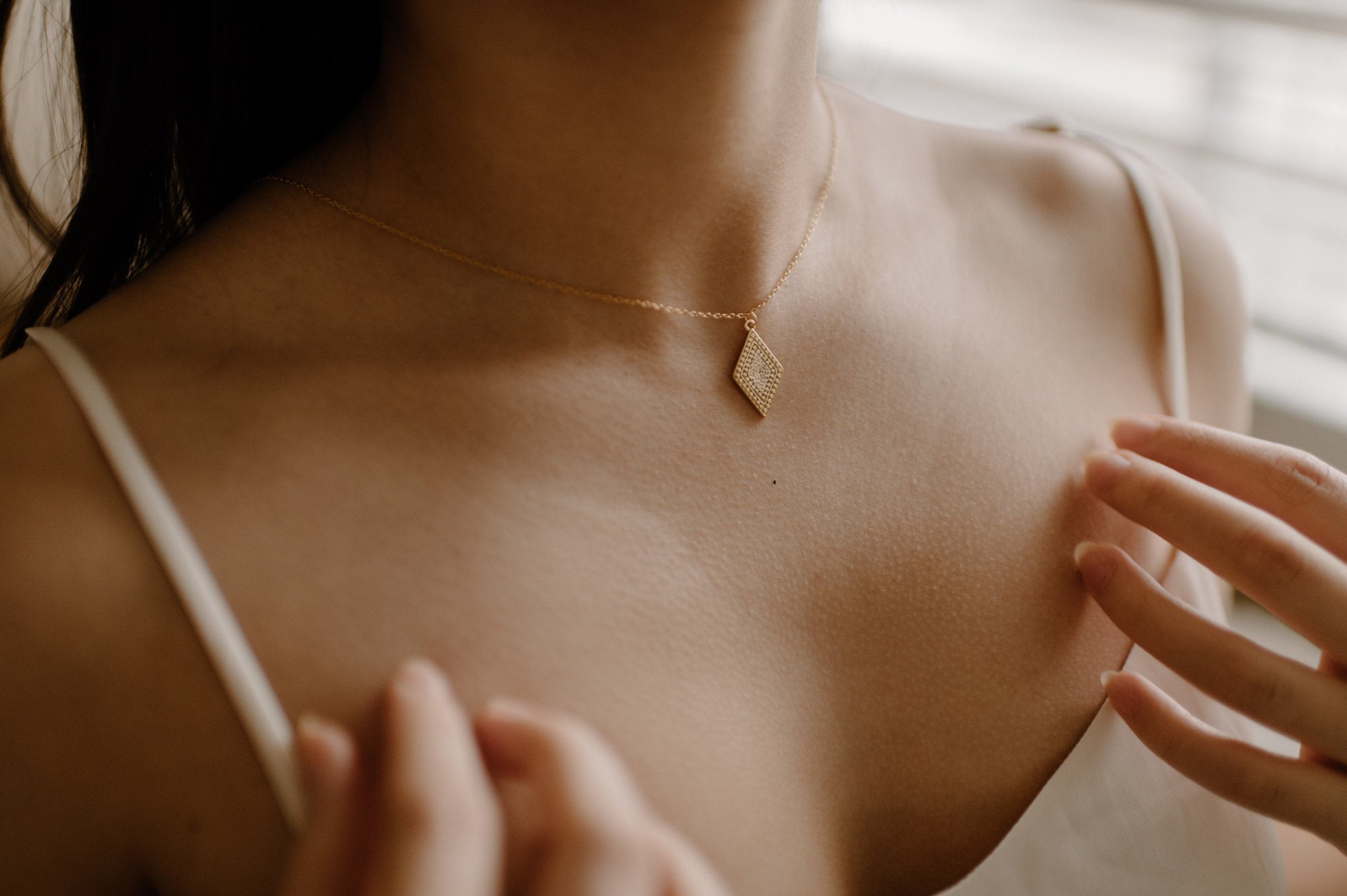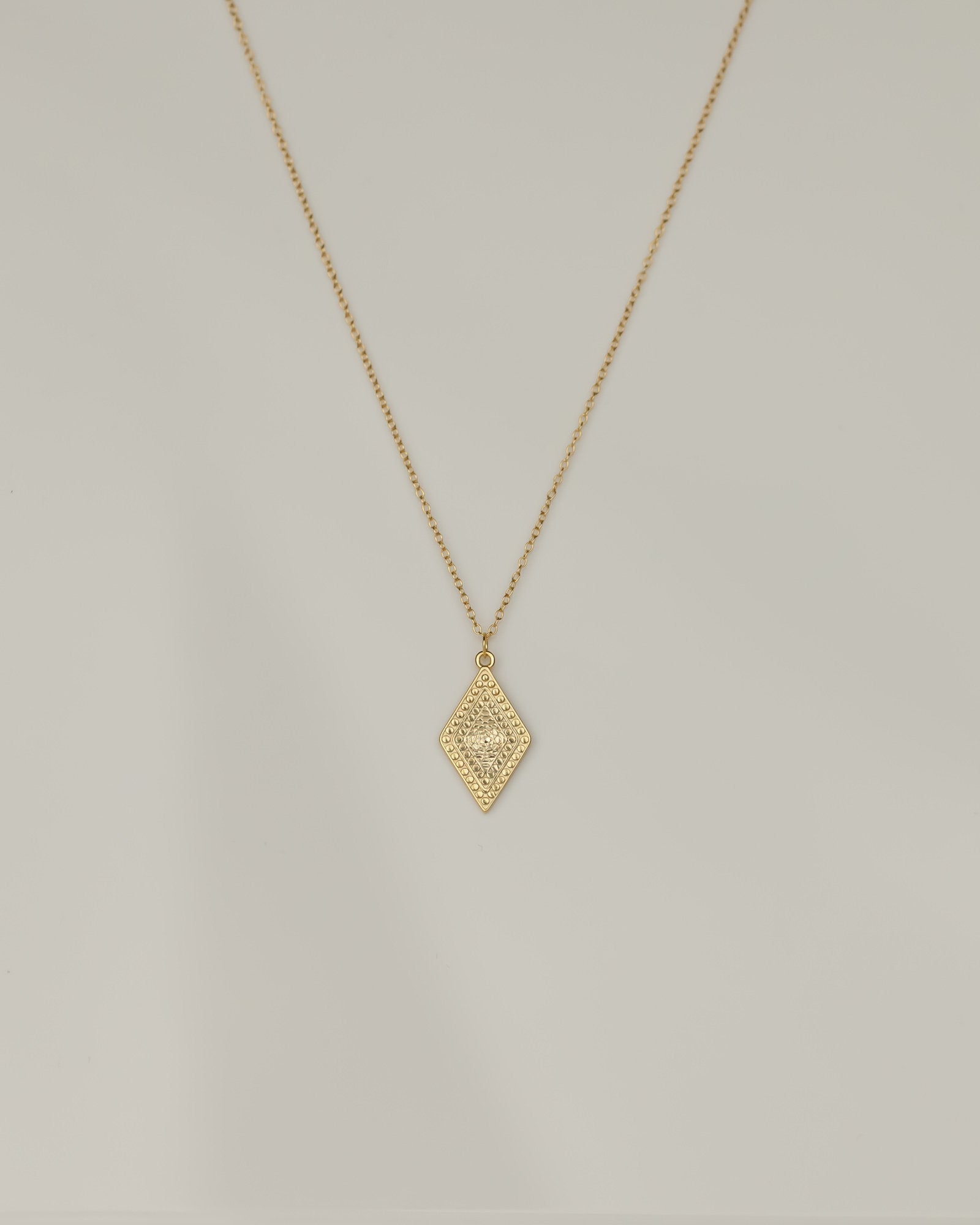 MEASUREMENTS: Cable chain is adjustable from 50 to 55cm with a lobster clasp closure. The rhombus measures 2cm long and 1.3cm wide. Total necklace weight (pendant + chain) is approximately 2.82 grams.